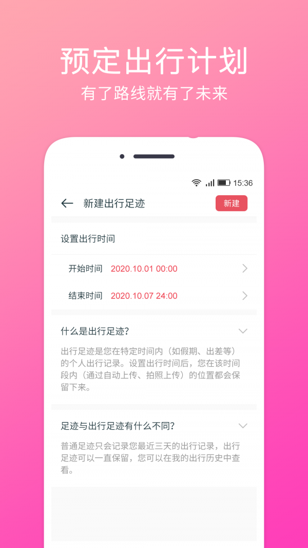 可以新建出行足迹,设置出行时间,您在该时间段内,通过自动上传,拍照上传的位置都会保留下来