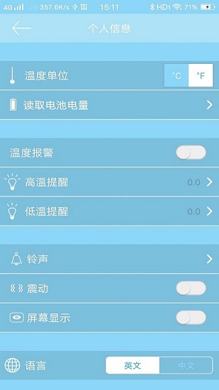 您可以设置您的报警温度,当超出您设置的报警温度是APP会一直提醒您(手机会一直响,直到您关闭报警为止)现在是在发泄,方便您及时采取退烧措施。