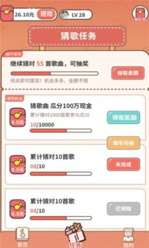 可以提现,没有任何的提现限制玩家可以随时进行提现,超多不同的挑战内容让你有更多不同玩法乐趣,类型不同的猜歌关卡自由选择,让自己不断完成更多任务来获得更多关卡奖励,更多不同的猜歌挑战等你来解锁挑战,丰富的玩法让你有更多获奖机会不断挑战赢得更多奖励。