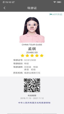 显示登录导游的电子导游证 ,扫描导游二维码即可显示电子导游证