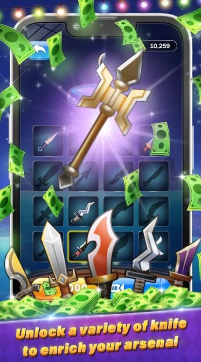疯狂砍钱是一款趣味性十足的休闲益智闯关类手游,在游戏的界面之中你会利用到一把锋利的刀来击碎游戏之中的钱,每一张钱币被击碎之后你就可以获取到丰富多样的奖励,每次闯关的时候一定要利用更加简洁的方法来进行对抗,看似非常的简单,实则需要一定的技巧,疯狂砍钱还提供了各种不同的工具可以解锁,欢迎喜欢的伙伴们和我一起来玩吧。