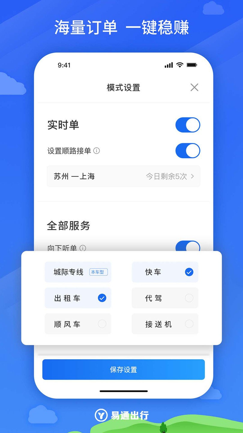 易通出行司机app是一款专门为用户打造的网约车软件,在这里用户可以在线上进行下单,司机就会立马到来。司机也会接各种单子,是司机的好帮手,不管是出差还是出去玩都能下单,帮助司机用户成为不同类型的出行司机,实时刷新乘客发布出行订单,快速接单,智能抢单,一键即可听单,还可以管理所有订单收益,需要的小伙伴们千万不能错过。