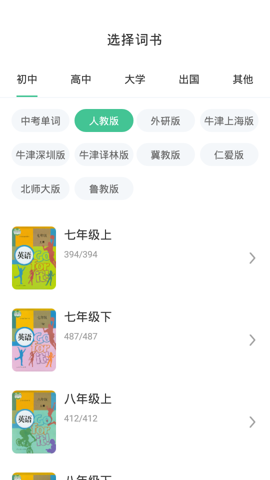 知米:分单词书和词组书,较为齐全,分类清晰,可支持自定义上传。