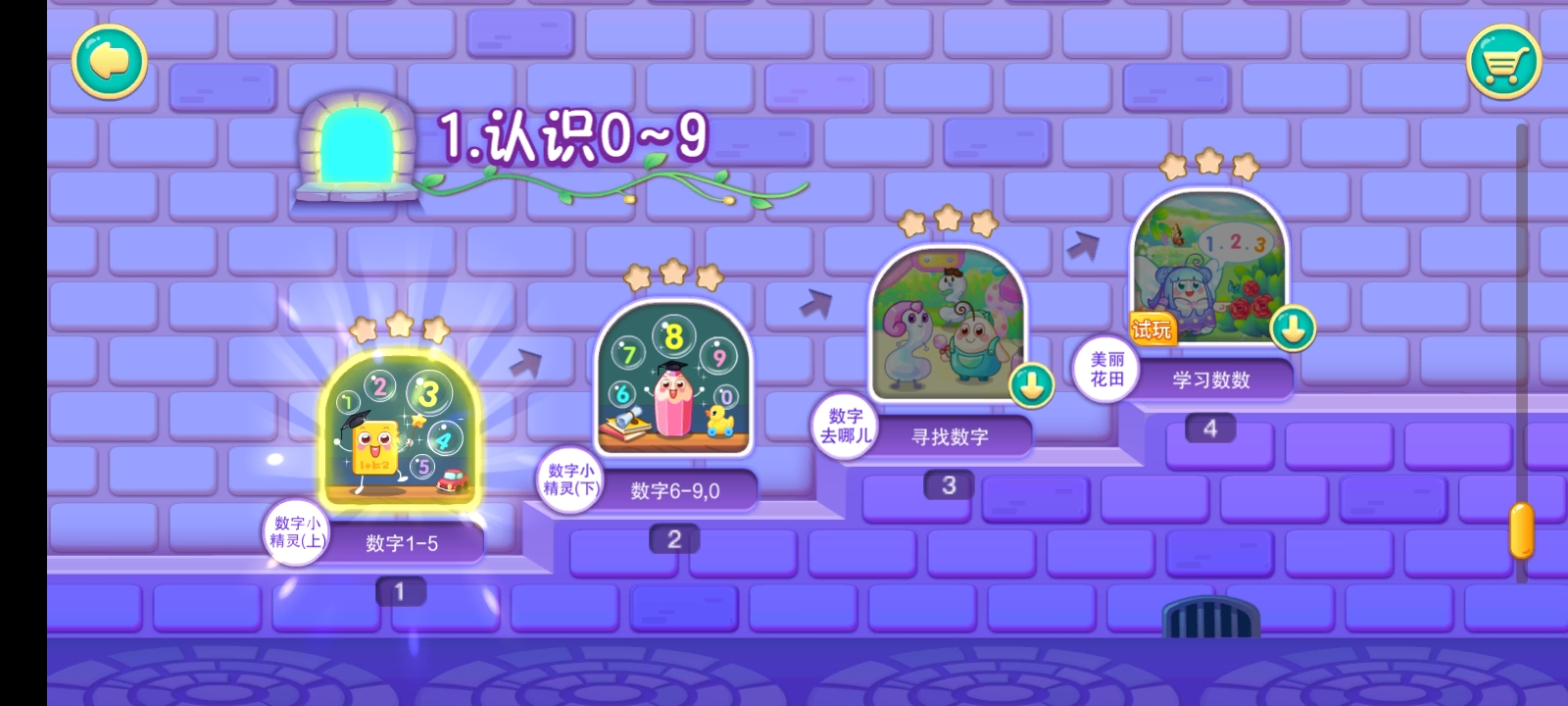 【认识0-9】:认识10以内的数字,学会点数和书写。包含“数字精灵(上)”、“数字精灵(下)”、“数字去哪儿”、“美丽花田”4节课程。