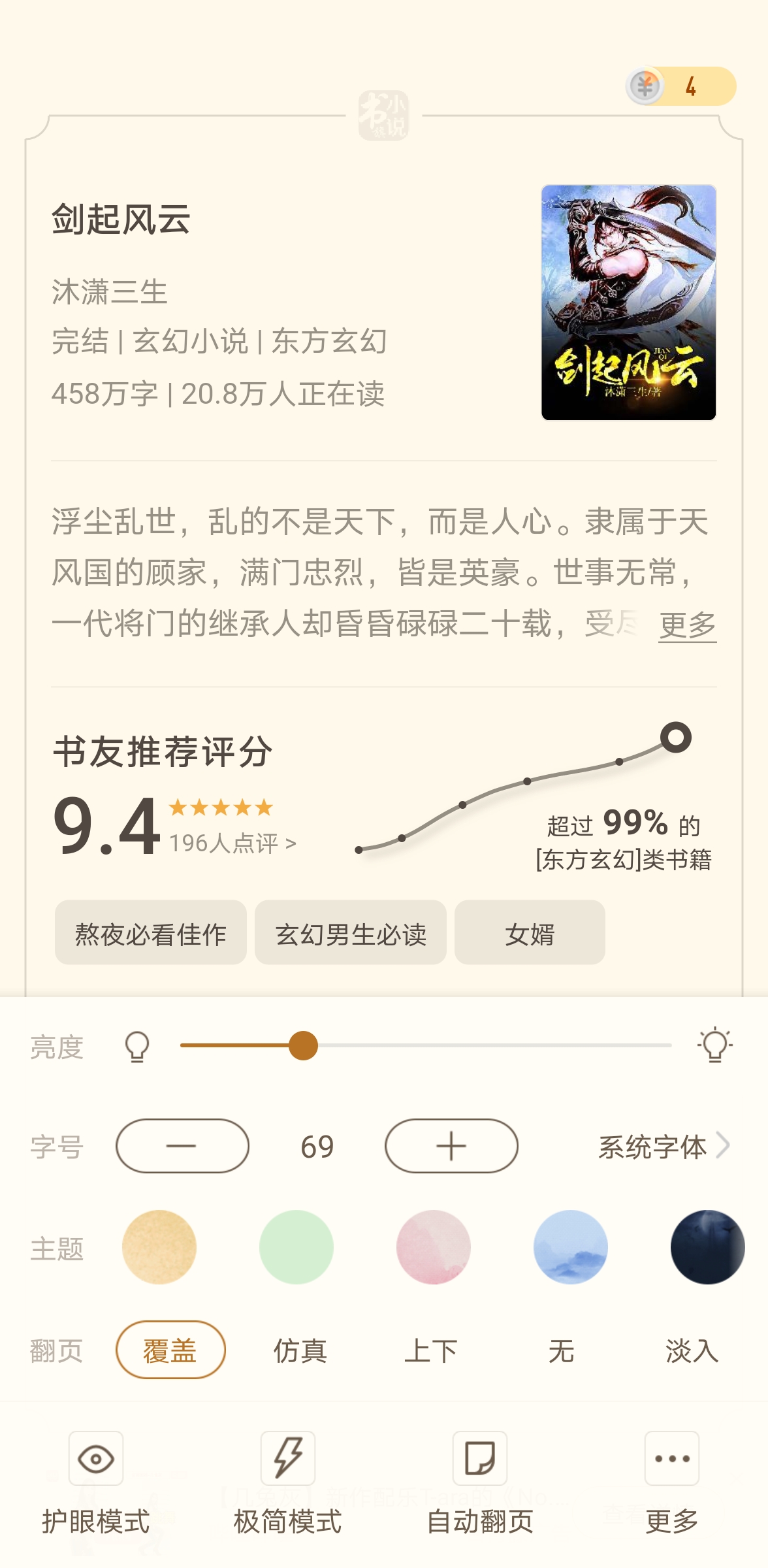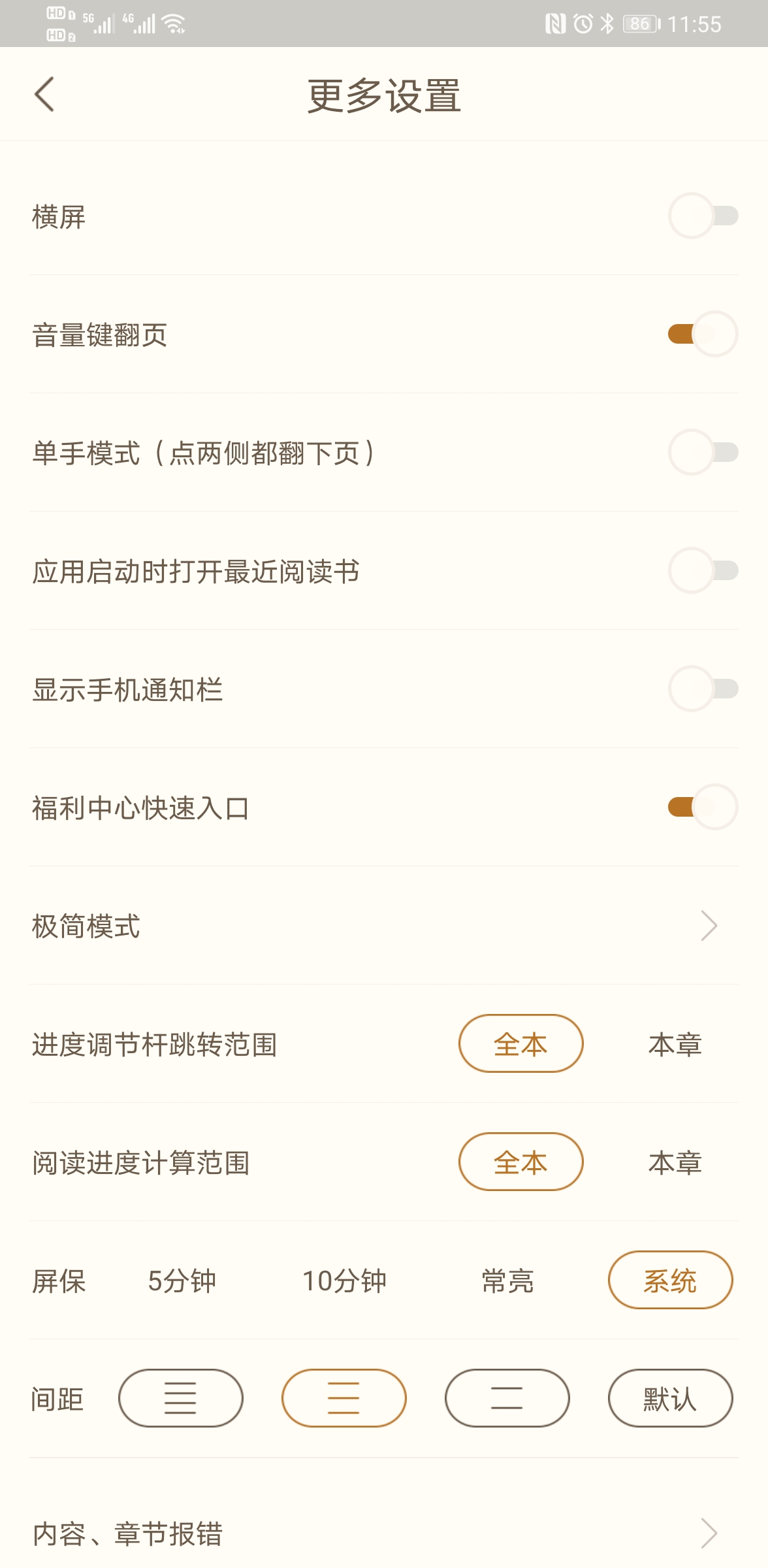 7、强大的个性设置,随意定义文字颜色,大小,背景样式,自动滚屏速度,翻页模式选择,夜间模式等。