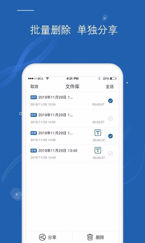 3. 支持音频管理,保存的音频文件可一键删除,重命名等;