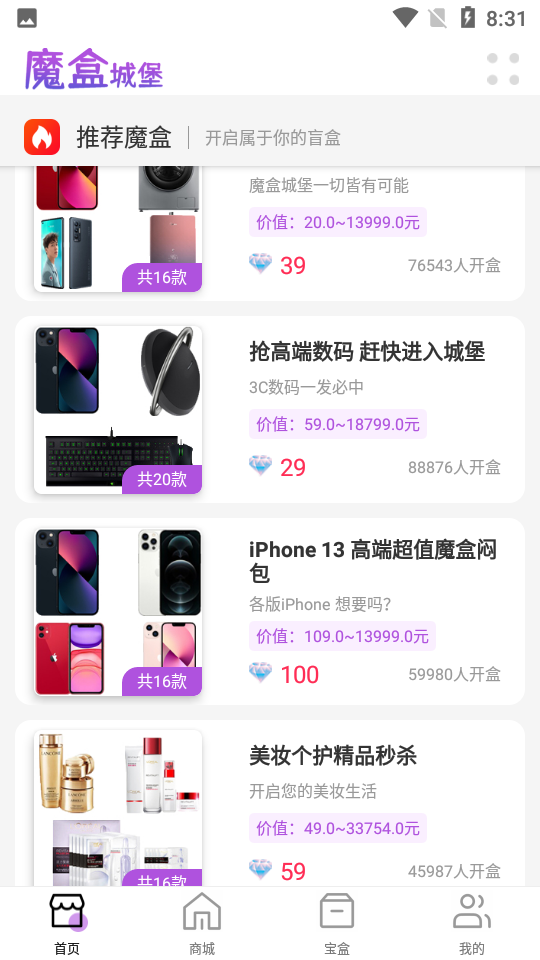 2、魔盒中拥有众多大牌商品,手机、数码、美妆、潮鞋等。各种珍藏款商品在线开启,必中商品。