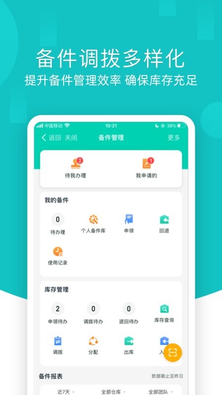 备件管理:自定义设置备件多级审批流程,建立不良品退换、服务商备件库管理等规范标准,