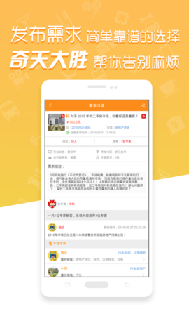 奇天大胜是一款提供综合生活服务一站式需求解决方案的手机应用,这里有超级严格的审核,并且提供多年靠谱的从业经验,为你提供更加值得信赖的咨询服务和靠谱实用的解决办法,你完全可以快速的获取咨询者们的解答需要,也可以在这里根据需求直接发问,整体来说使用真的比较简单,所有问题都可以在这里快速迎刃而解哦。