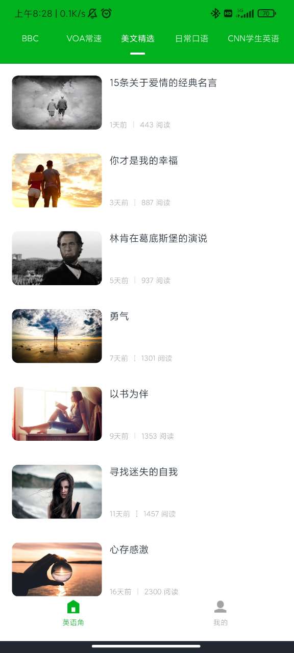 1、软件中提供了各种常用英文文章的内容供用户查看和使用,包括但不限于精选美文、日常口语、便携英语、地道英语口语等。