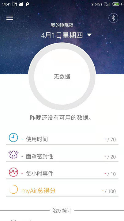 您可以查看两个选项:“治疗”和“面罩贴合”。转到“治疗”以访问舒适度设置,并转到“面罩贴合”以检查是否漏气。