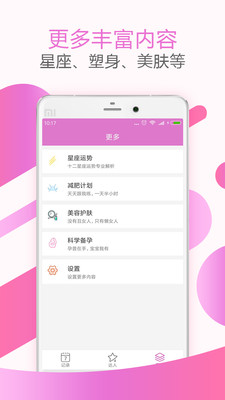 3.星座运势:预测您今日、明天、本周及未来一个月的运势情况。 你想拥有一款界面新颖、功能全面的专属大姨妈管家吗?你已经使用过美柚、大姨妈、大姨夫、暖暖安全期、半米排卵期、月经期安全期助理、姨妈助手、西柚大姨妈等月经记录和生理期记录手机工具吗?如果你想有一个新的体验,那就选择我们吧。不那么惊艳,不那么绚丽,不那么主流,我们只是想将您当做VIP用户看待,认真对待每一个用户,随时关心您的生理健康,每天贴心守护24小时。