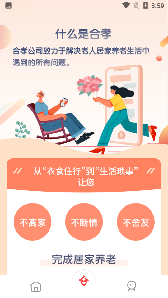重庆合孝养老这是一款可以满足老人居家生活的所有问题服务平台,从“衣食住行”到“生活琐事”,从各个方面照顾老年人。在这里有基本的购物、送餐还有远程监护、智能语音、智能报警等等,可以有效的保证老年人安全同时还可以关注身心健康,软件内还有营养膳食,根据专家的搭配直接送餐上门,有需要的用户们可以下载使用啦!