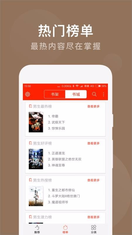 2.提供更多最热榜、好评榜、热搜榜、潜力榜等榜单小说,任用户随心去选择;