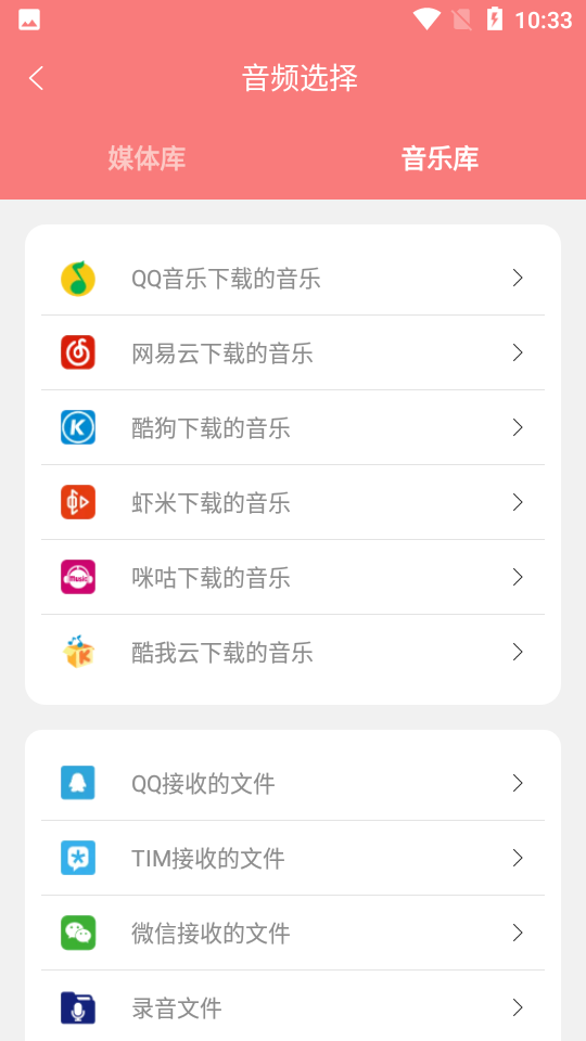 视频提取音频:将喜欢的短视频电影导入,轻松提取视频里的背景音乐音频,亦可再次剪辑制作,做成手机铃声配音铃声,可玩性十足。