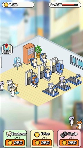 3.游戏中所有角色都是可爱的动物形象,玩家需要增加设计各种健身设备,吸引更多可爱的猫咪来到这里健身,赚取更多财富。