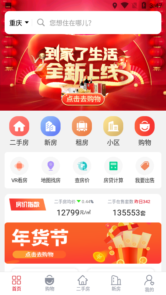 到家了生活是一款将房产和手机购物相结合的手机实用软件,在软件中可以VR看房,足不出户在手机上就可以浏览,海量的新房和二手房供你挑选;年货节到了,可以在此软件中买到好物。了解一些关于房地产的信息相对较好,直接手机可以查询一些最新最全面的住房信息,销售服务推荐和一些新房子和二手住房服务信息推荐在上面,直接手机选择和购买更容易。