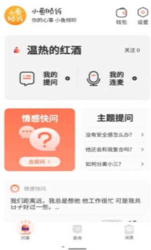 2、团队有百位理论、实践经验丰富的专业老师组成,小鱼倾诉解忧,提供情感咨询服务;