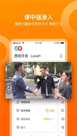 学习系统:课前强参与,在课前学习重点知识;课中强浸入,情景化趣味性教学方式,寓教于乐;课后强巩固,智能化习题实现知识复现;结果导向型评测方式,完成课程并通过评测后可获得该语种的学习证书。