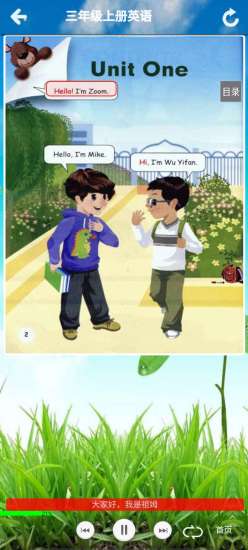 3、高清的全彩电子课本(电子书)。电子书:可点读、连读;页面上的“所有英文”均配有中文翻译。