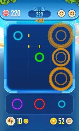 3、在这里面需要使用一些不同颜色的彩环来进行消除操作,只要能够将这些彩环放置在同一条线之中。