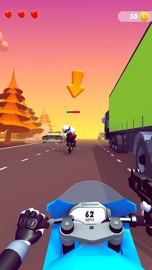 3、在驾驶着摩托车进行前进的同时,利用游戏中的枪械来对不同的敌人进行射击,超爽快的驾驶射击乐趣。