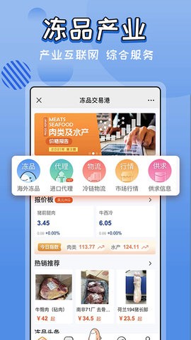 2.支持冻品批发,商户代理,价格指数查询等服务,全力打造冻品产业综合服务平台