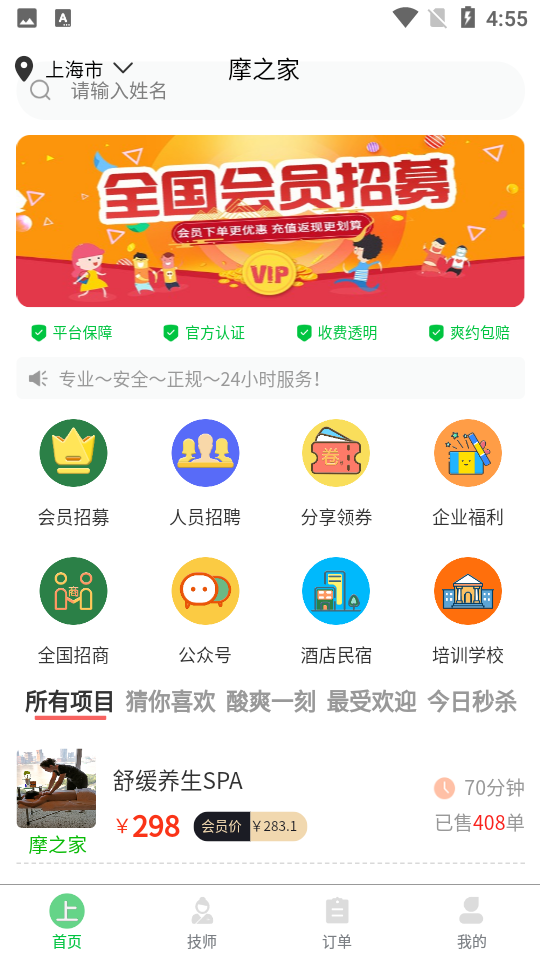 上门服务:用户可以根据自己的身体情况,选择合适的按摩项目,查看项目详情,筛选技师,按服务商选择,按接单排序选择,按好评多选择