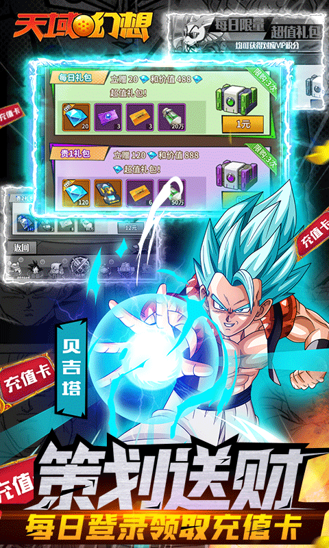 1.上线既送VIP9, 赠送128888钻石,300万金币,四星紫卡天津饭!