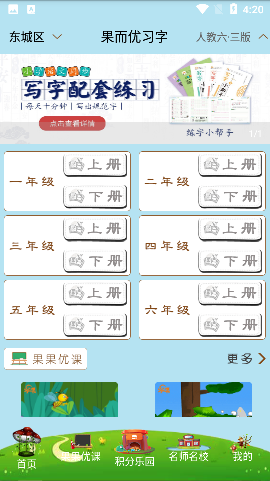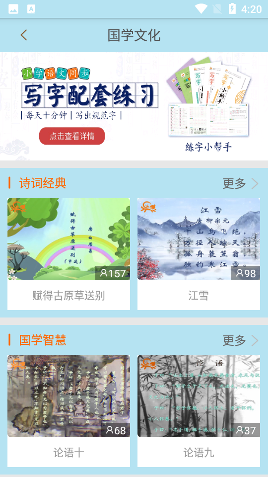 果而优习字是款叫小孩子识字写字的软件,包含了各种毛笔板书等多样的字体师范,更有专业的老师通过各种不同的方式来进行指导,规范你的字体语言。操作简单、使用方便。在当前社会环境下,开发此款移动软件,目的让越来越多的人了解中国传统文化,规范书写汉字、学习传统书法,喜欢古诗词,人人能吟。潜移默化。每一个人能带动身边的人或下一代人扬中华传统文化,品诗词汉字之美。