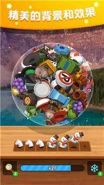 1、匹配3个相同的物体!只要找到并点击三个相同的物体,直到通明气泡球内的物体完全被消除,就通关啦。