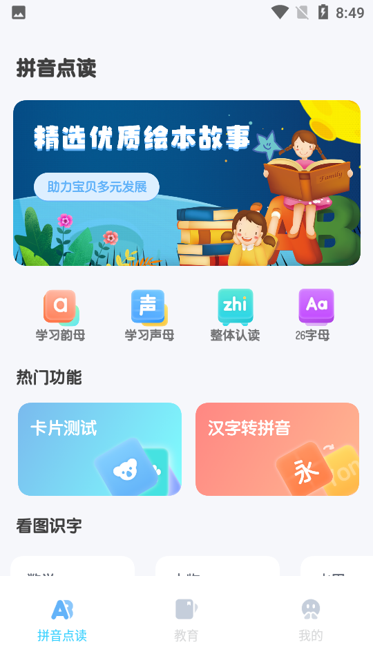 4、看图识字:以生动活泼的图片搭配拼音读音,图文结合,容易识记。