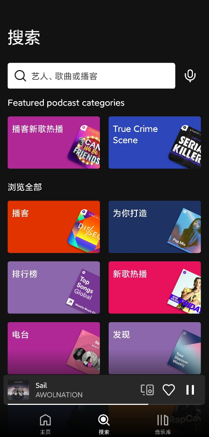 搜索歌曲或专辑并播放;每时每刻的最新排名,新发行和完善的播放列表;