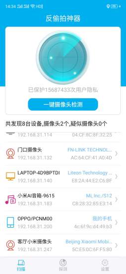 反偷拍神器是一款为用户提供安全保障的智能服务平台,大家在平台里面可以安全的使用这款软件,能保护用户的安全隐私的软件,简单实用的针孔摄像头探测器 反偷拍神器根据fing的原理分析局域网中每台设备的网络及硬件特征,根据这些特征来发现局域网中的针孔摄像头。 同时它也可以通过红外线扫描来找到隐藏着的针孔摄像头。是您租房、住店、旅行的必备神器,防偷拍让您不用再担心成为“小视频”的主角。