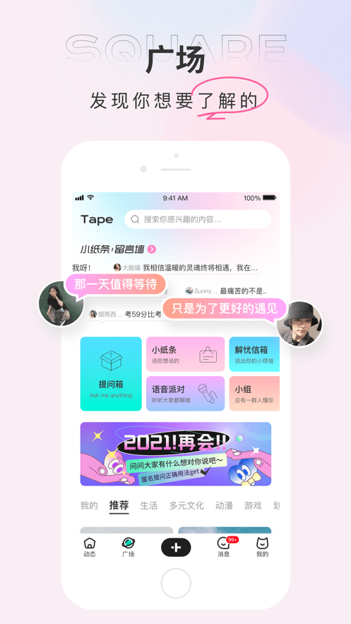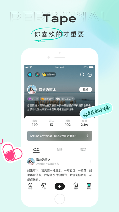 Tape小纸条app,汇聚来自五湖四海的小伙伴,多种话题、圈子尽在其中,加入感兴趣的社交圈,发现想要了解的人,认识更多新伙伴。Tape app,分享喜欢的的内容。Tape,完全按照你的关注与订阅去展示内容,每个人都可以定制自己的社交圈,你想看什么,Tape展示什么,每个人的Tape都独一无二。