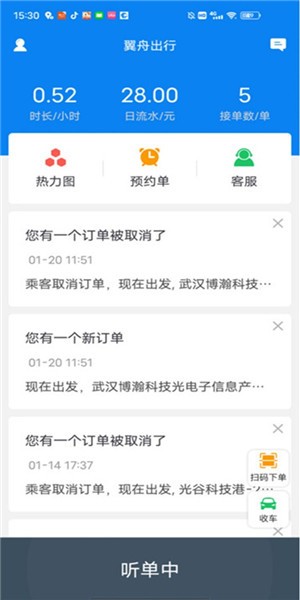 翼舟出行司机端app是一款主要是提供司机接单、与客户互动、查看走单任务功能的应用软件,打造的一款方便用户出行为目的的智能应用程序。随时都可以轻松的接单,解决传统接单载客方式存在的痛点,让大家享受更加优质的出行服务。可以提供司机接单服务,查看附近订单,可以给司机推荐合适的路线,支持线上抢单,可以与客户在线交流,语音播报路线,查看每单佣金,记录接单收入,可以生成每月收入状况。
