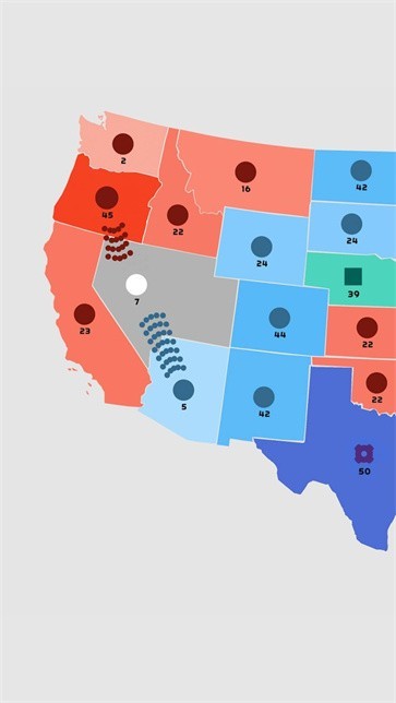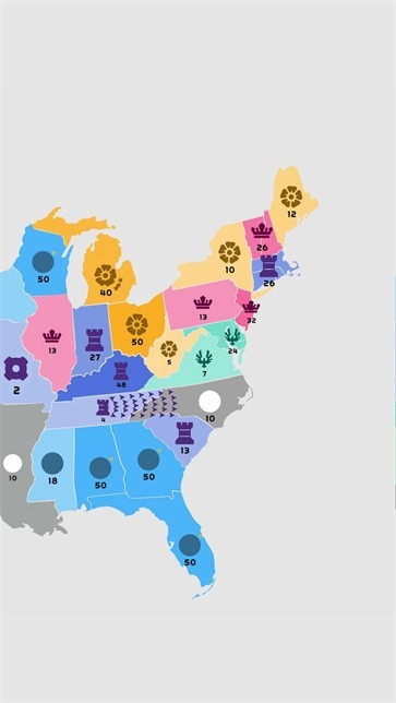 3,画风简单,玩起来轻松有趣,不同的颜色代表不同的阵营,每个领域的数字代表你的实力,用自己的力量尽可能多地占领领地。