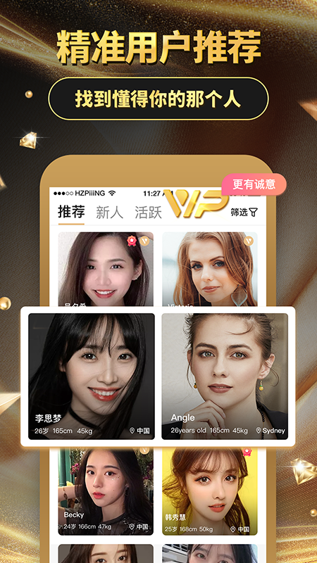 铂金交友拥有全球优质用户数据库,轻松划一划就可以为你匹配适合你的那个Ta