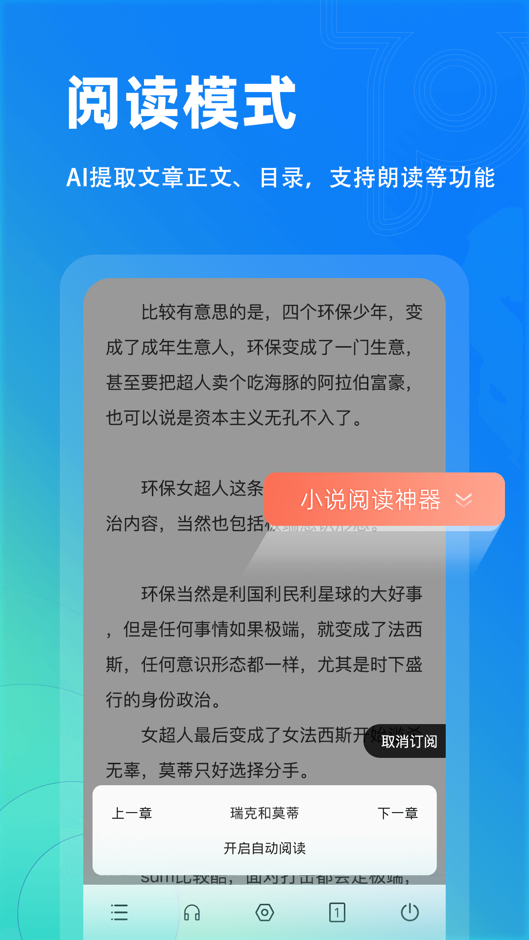 1、阅读模式,智能提取文章正文、目录,支持朗读、自动阅读等功能,下拉翻页,看小说神器,媲美小说APP的阅读体验。