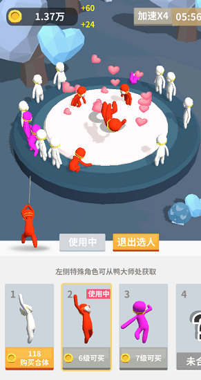 达成一定的等级即可解锁更多花式的人物角色,而且购买角色还能带来不错的金币收益,而且这些角色会自动两两合成为更高级的角色哦。