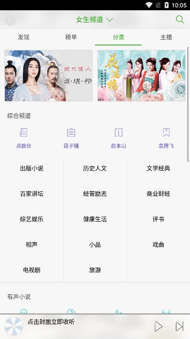 100,000小时有声内容,20,000部有声作品,汇聚评书相声、都市言情、武侠奇幻、儿童读物、幽默笑话等20个大类。