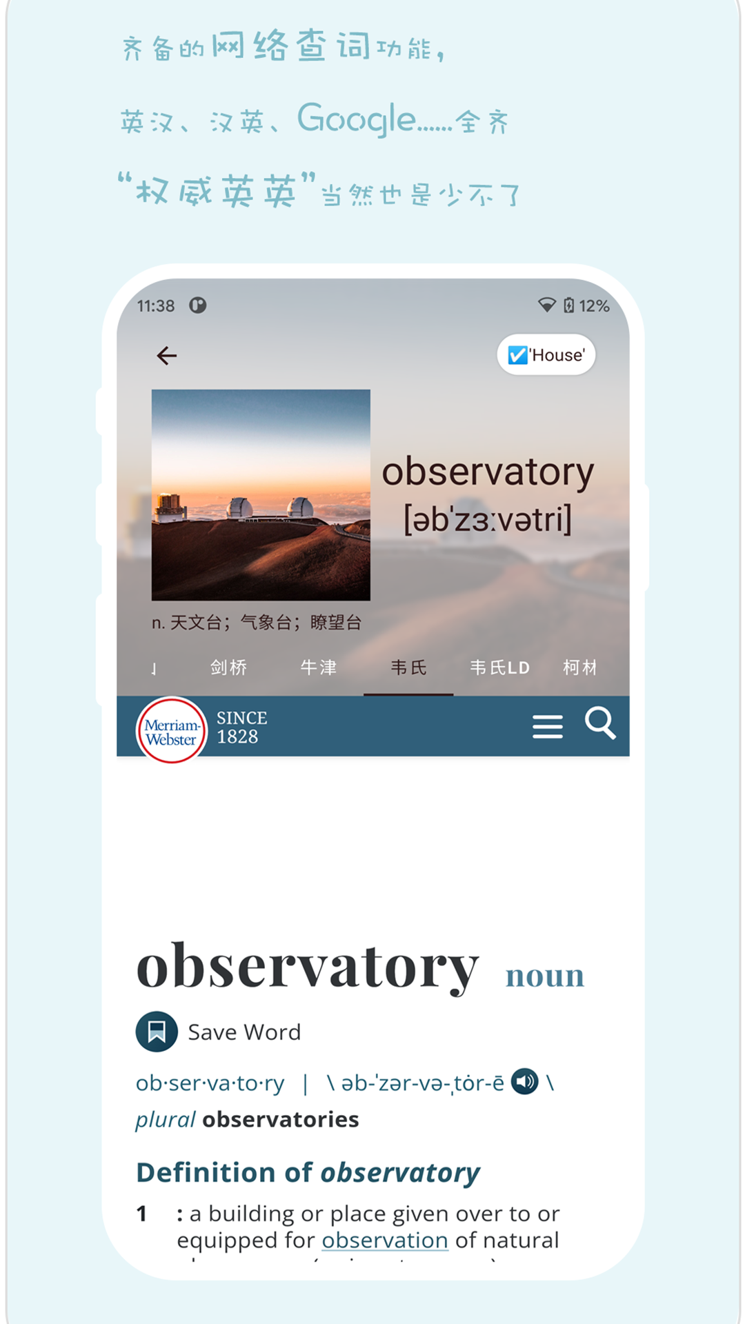 通过搜索或简单的点击图片单词,可以轻松查看词汇的定义和其他网络词库中的信息。不仅包含Google翻译这类简单但高效准确的词汇翻译,同样也有Collins(柯林斯)、Oxford(牛津)和 Webster(韦氏词典)这样的权威英英词典内容。