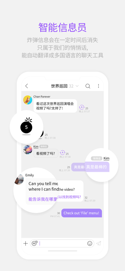 该聊天工具可以自动翻译成多国语言,只要有相同兴趣,就能结交全世界的朋友