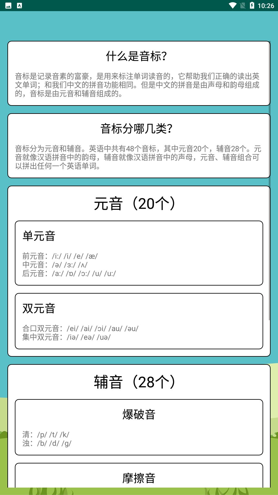 英语音标学习助手是一款非常有用简便的英语音标学习软件,介绍详细,发音准确,能很好的让用户理解掌握音标,非常不错,帮助你更好的解决音标学习的问题,通过专业的音标课程加上辅助学习的训练等内容来帮助你稳固音标知识,给你带来别样的体验,你还在等什么呢,赶快来下载试试吧!