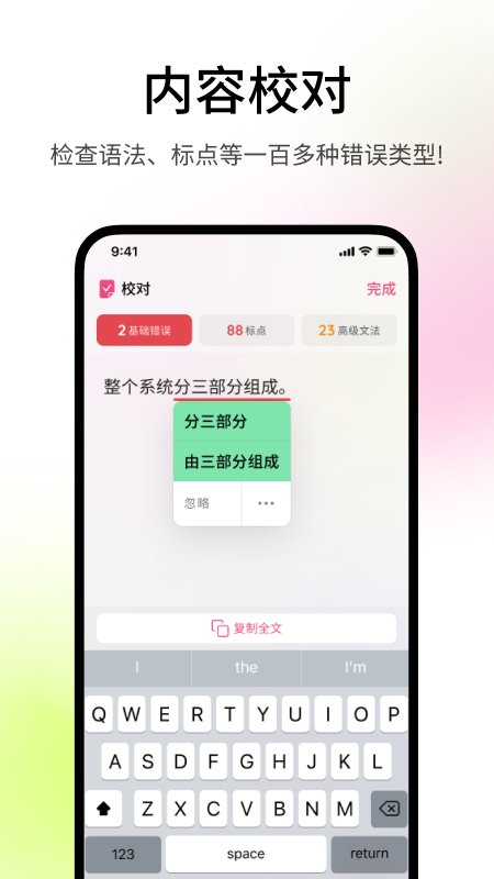 2、我们知道,在内容创作时,你未必能时时兼顾所有细节。因此我们提供文本校对功能,中文和英文都可以校对。节省的时间,你可以去体验有趣的世界。我们也提供阅读翻译和写作翻译功能,让你的英文写作和阅读体验更愉快。
