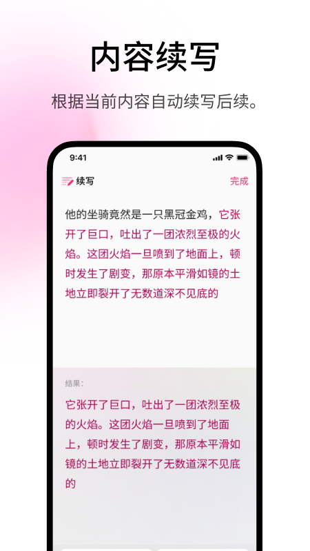 根据少量文字AI自动生成后续内容,广泛适用于公文、论文、小说、媒体文章的写作,中文和英文均可续写。