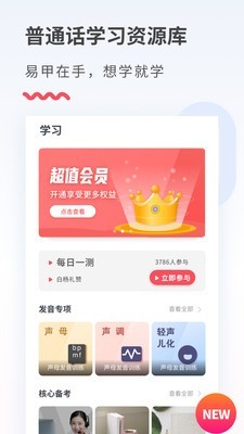 易甲普通话app是一款普通话学习类手机软件,这里含有海量的普通话文本阅读素材、声母、韵母、声调等听力训练,还可以将自己的朗读内容进行录音与原音进行比较,找出自己的问题所在,有针对性的进行专项训练,快速提升普通话水平,喜爱的朋友赶快下载体验吧!你可以从听、说等多个方面来提升自己普通话的水平。