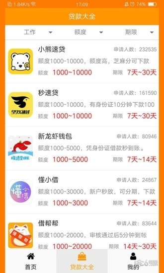 1、首页视野:极速借款、大额分类,满足不同借贷需求。