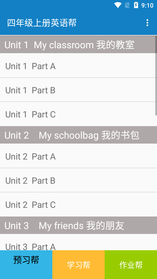 四年级上册英语帮是一款小学学习英语教材软件。这里汇集了英语教材知识内容,让用户随时随地都可以学习英语,掌握知识点。课后温习一下英语单词,操作简单方便,提升孩子的应试能力!包括课文朗读、单词朗读、中英文读单词、电子书、组合朗读、单词自测、音标点读、音标连读等学习方式,学生可以根据自己的不足之处,选择需要学习的方式,四年级上册英语帮这样有助于学习,还可以提高学生的学习效率。