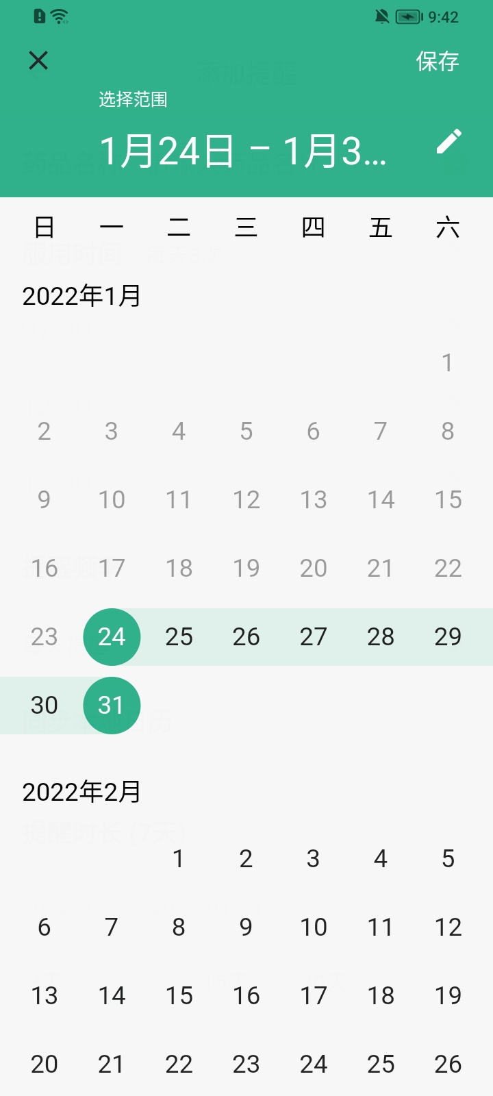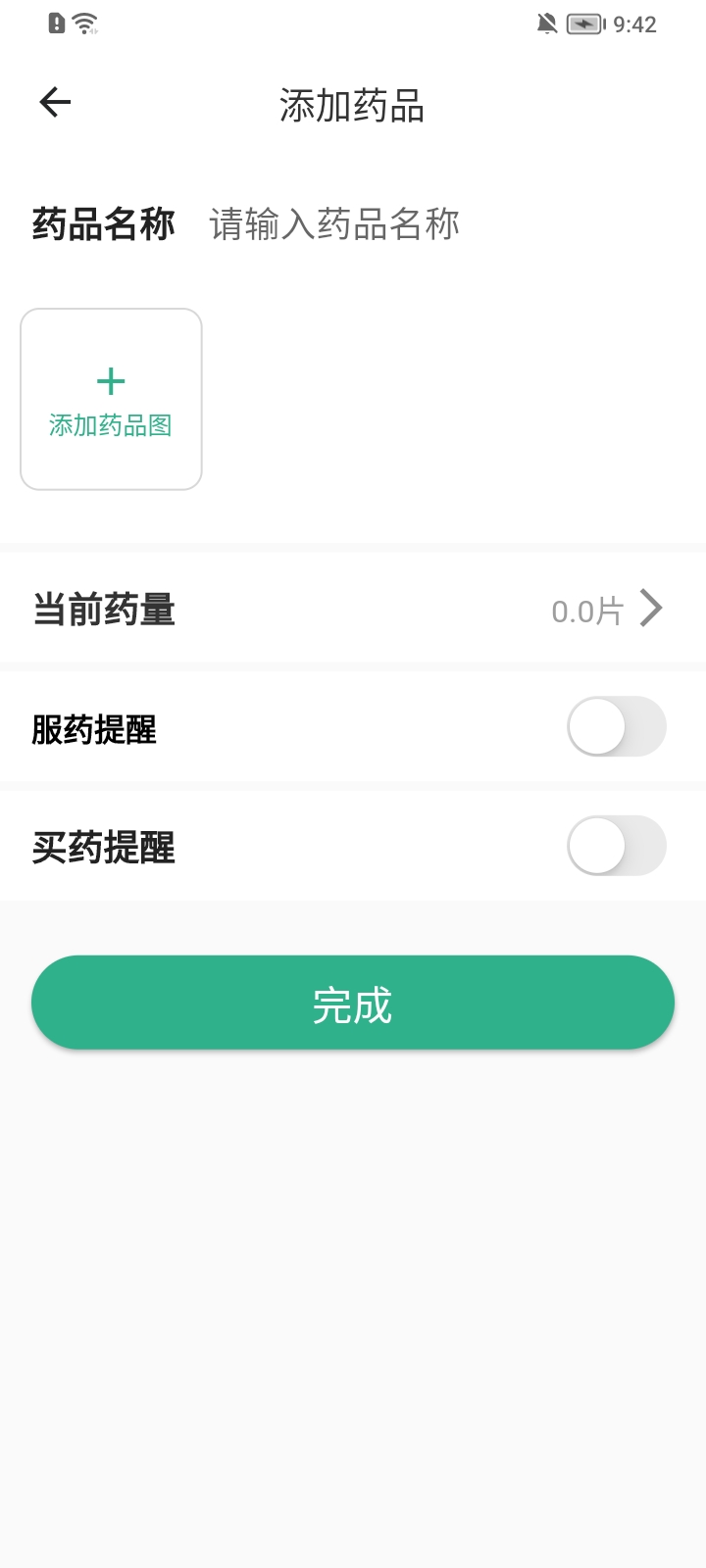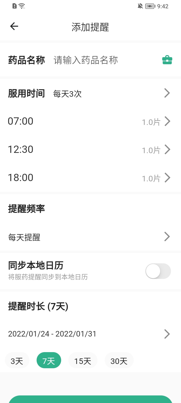4、设置服药时间、药品名、药品剂量,到您设置的时间会自动提醒您及时服药,支持一天1次、一天n次、每天服药、每n天服药等多种模式。
